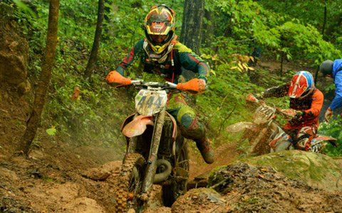 Though it’s possibly less famous than the roads and races, Tennessee is known by locals for its sporadic mountain weather in certain regions which leads to common sayings like, “Don’t like the weather? Hang on little bit and it’ll change.” The weather reinforced this adage on Sunday with a strong summer shower during the second knockout round. It watered the boulder gardens and turned the loose dirt hill climbs into sloppy muddy ascends. The shower didn’t last a half an hour, but it completely transformed the course. Correct lines through the brutal terrain were suddenly morphed into cascading mudslides that were impassable to anyone except the front runners, a few of whom, danced through as though it had never rained. It was fascinating to see how the course changed throughout the day as riders chose different lines during the race. The Tennessee Knock Out definitely earns its classification as an Extreme Enduro. Some of the competitors were so tired it looked as if they could barely hang on to the handlebars as they navigated the brutal terrain.